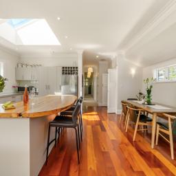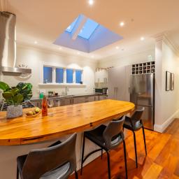 The open-plan living and dining area is filled with natural light, enhanced by large skylights that create a bright, inviting atmosphere. The family-sized kitchen sits at the heart of the home - spacious, well-appointed, and ideal for entertaining friends or gathering with family.
