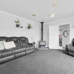 The inviting lounge enjoys effortless indoor-outdoor flow to the northwest-facing deck, creating a sun-soaked setting for summer evenings and a cozy retreat in winter. A woodburner, heat-transfer system, and heat pump ensure year-round comfort, while recently added wall insulation keeps the home snug through the colder months.