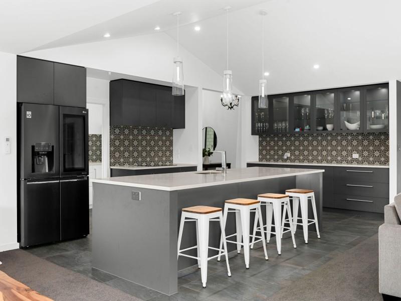 The designer kitchen is a true statement, featuring sleek dark cabinetry, an expansive island, quality appliances, and a walk-in scullery. Open-plan dining and living areas provide an inviting hub for everyday connection, while a separate media room offers a quiet retreat for movie nights or guests.