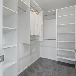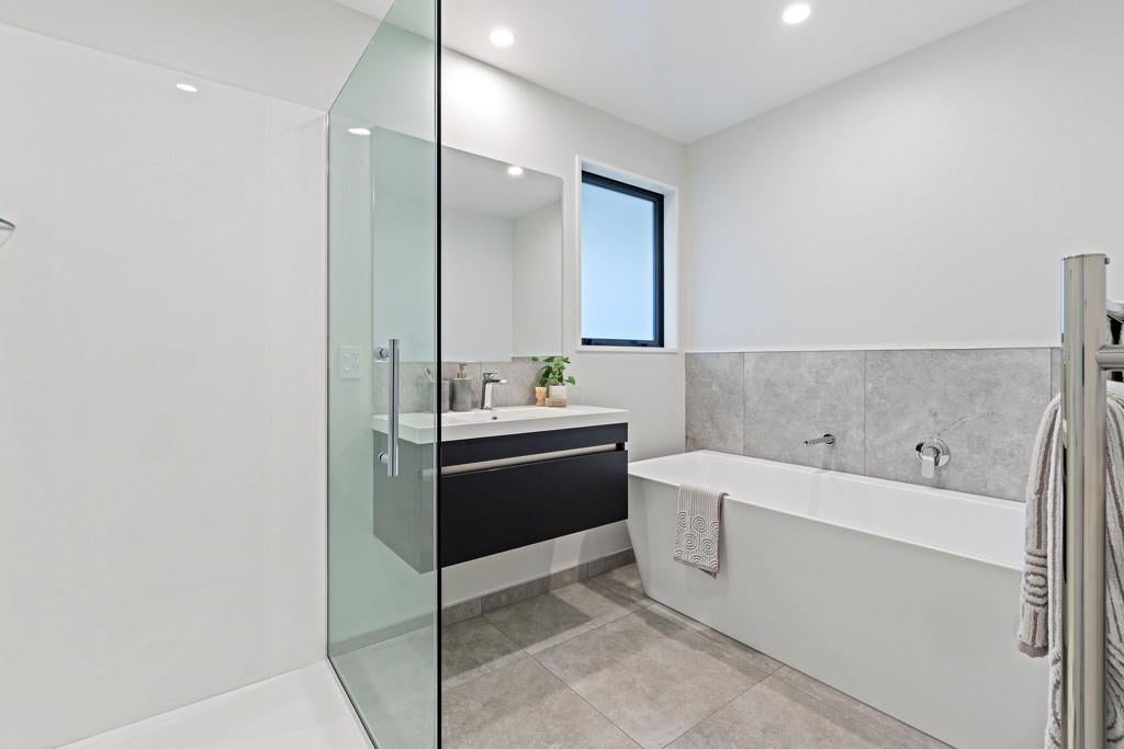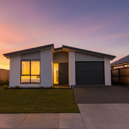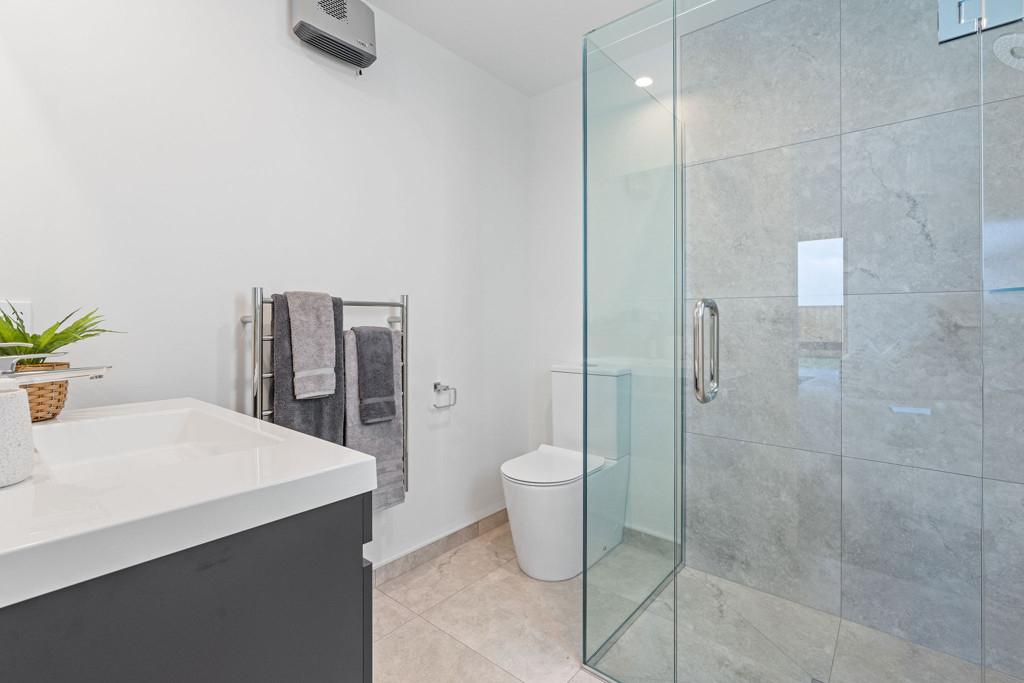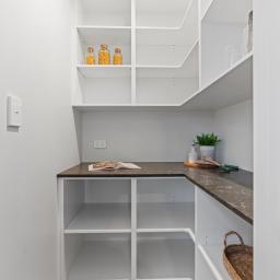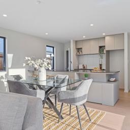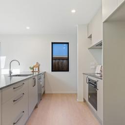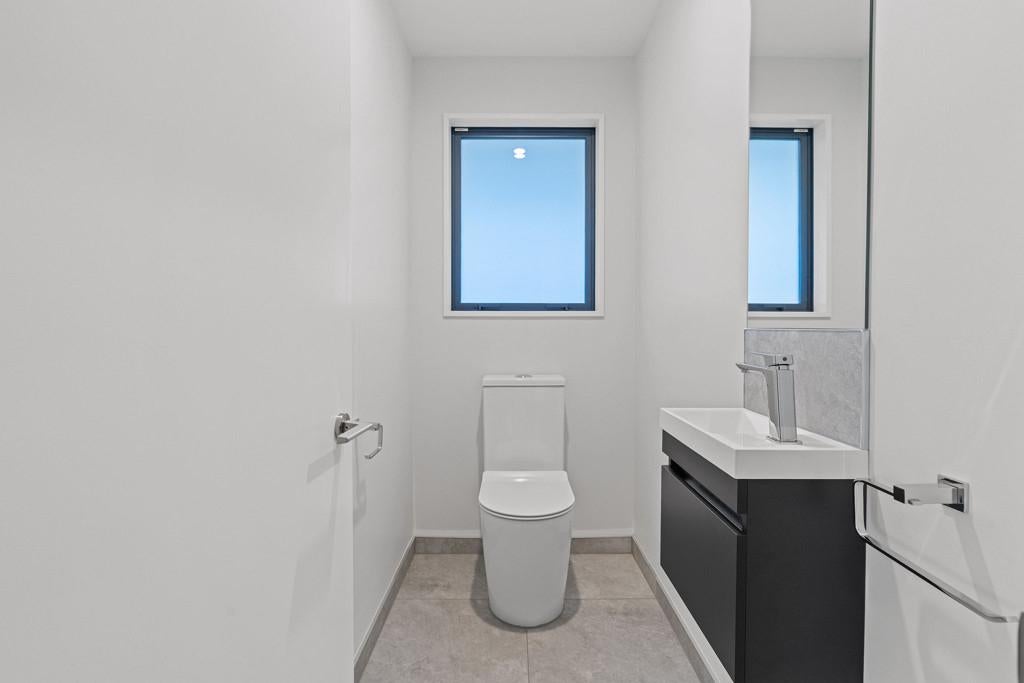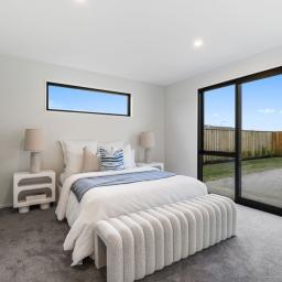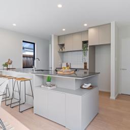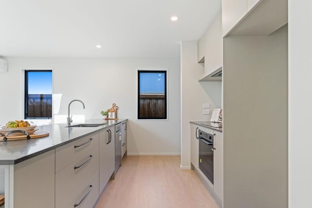 The home features three double bedrooms, including a master with walk-in wardrobe and ensuite. A family bathroom and separate toilet provide convenience for the household, while the open-plan kitchen, dining, and living areas form the heart of the home. The modern kitchen includes a walk-in pantry, combining style with practicality.