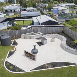 The design also incorporates some amazing local materials. Virtical Exterior Redwood Cladding from Hamurana Springs. Featured exterior batterns are Himalayan Ceder from a felled tree from Mount Ngongotaha and gifted to the developer. Rimu floorboards from QE Hospital have been converted into amazing internal wallboards in the dining area, the front door is from the Historic Lakehouse Tavern. Exterior feature timber linings to concrete seats and tables-Redwood from Hamurana Springs. Architraves and skirtings also Redwood from Hamurana Springs and the entry hand rail is native Rimu from the Lake House Tavern.