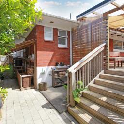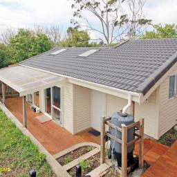 Sheltered patio and decking wraps around the home to encourage daily life outdoors, met by a level lawn and raised garden beds that keep upkeep minimal.