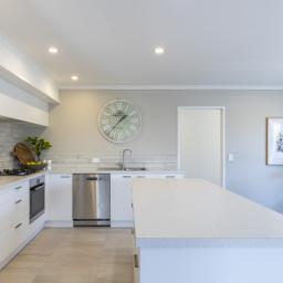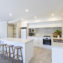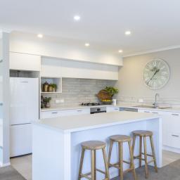 The kitchen is stylish and functional, featuring a gas cooktop, electric oven, rangehood, dishwasher, and an island bench for casual dining.