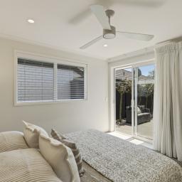 Three generous bedrooms are positioned to capture the sunlight, including a primary suite with walk-in wardrobe and ensuite. Quality finishes continue throughout - from plantation shutters and quality flooring to gas heating, infinity hot water, and thoughtful touches like louver windows for ventilation.