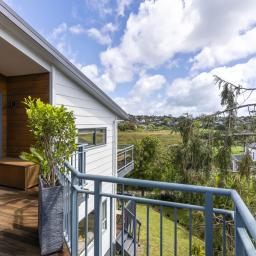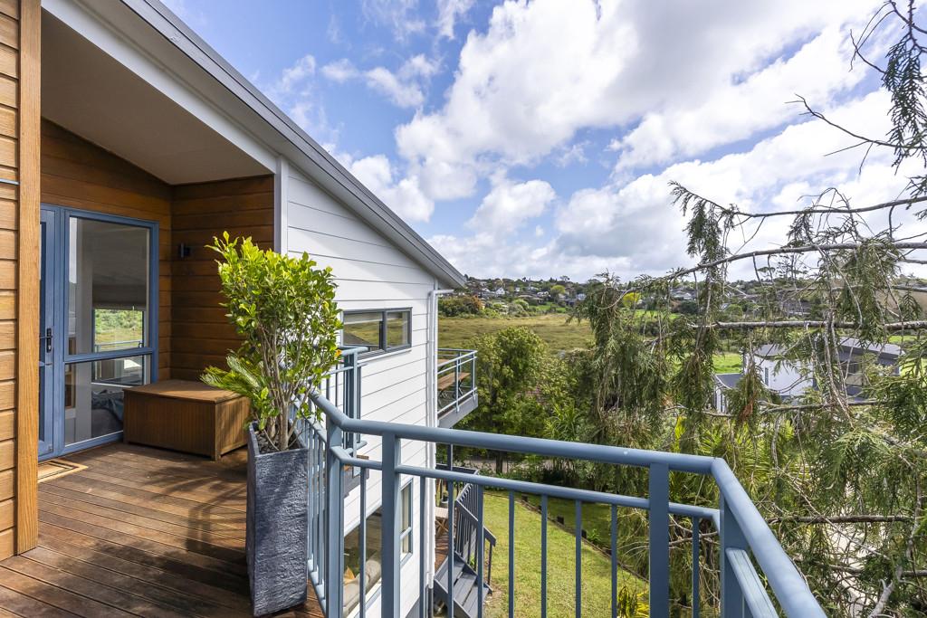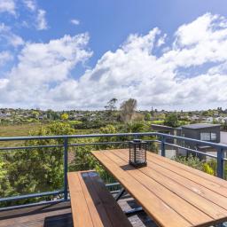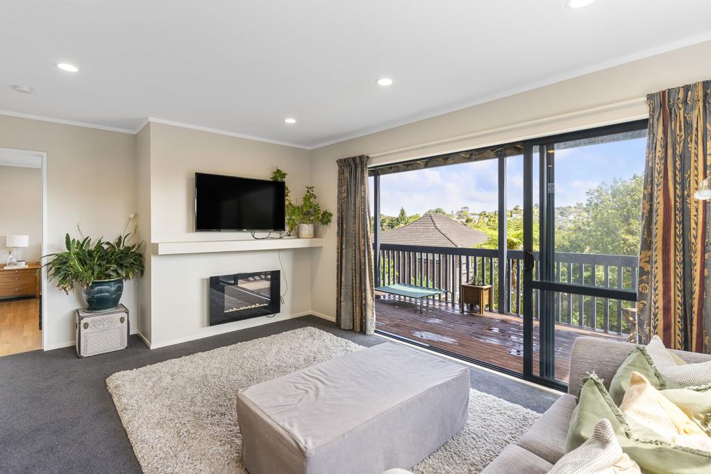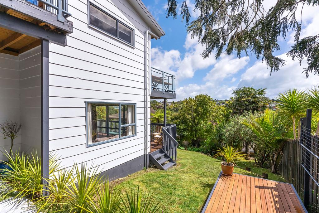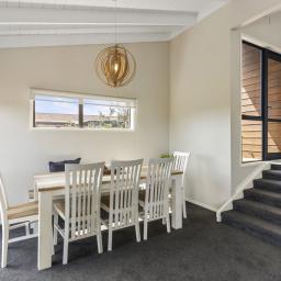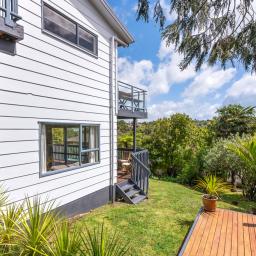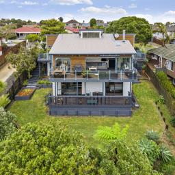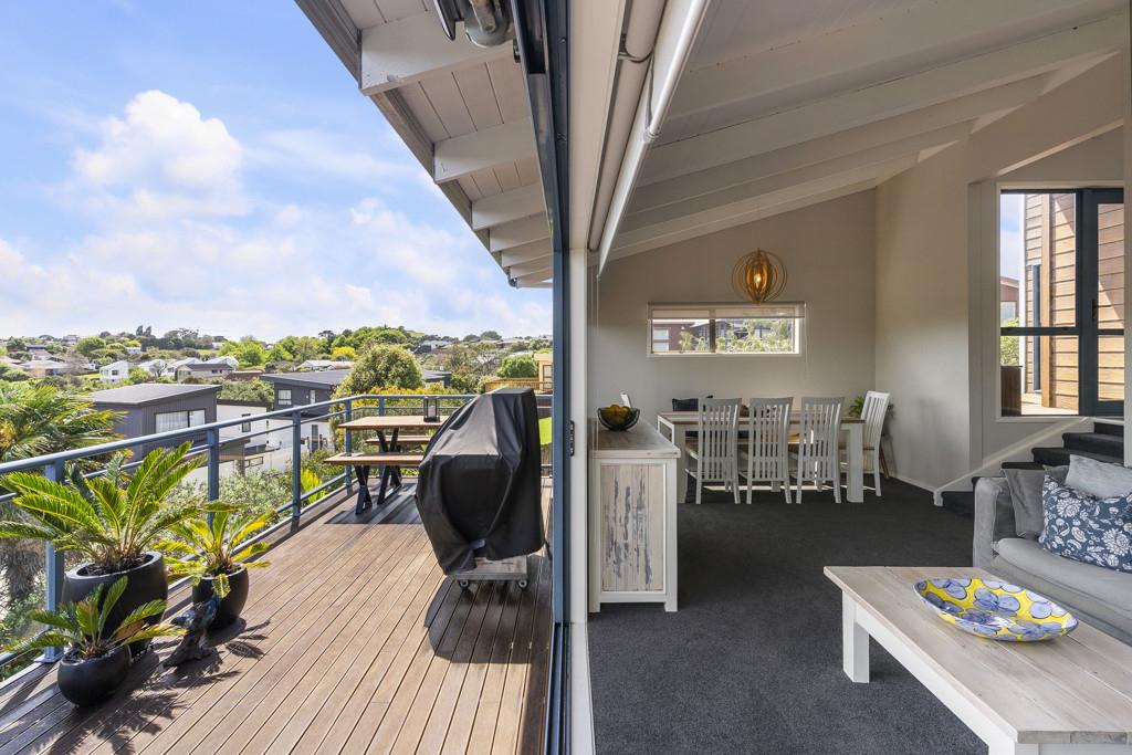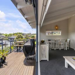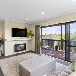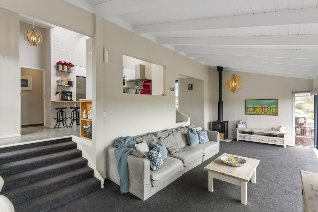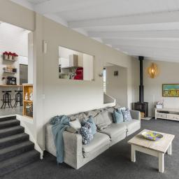 Bedrooms are cleverly located across both levels, with three on this floor and two on the lower level, including one with a semi ensuite. There is also a spacious second family lounge and a covered deck for all weather barbecues, with stairs down to the lawn. Both bathrooms are modern and well-appointed.