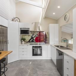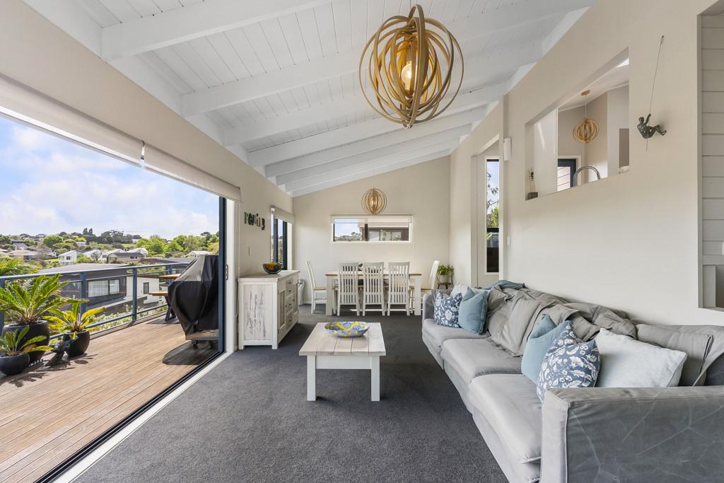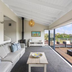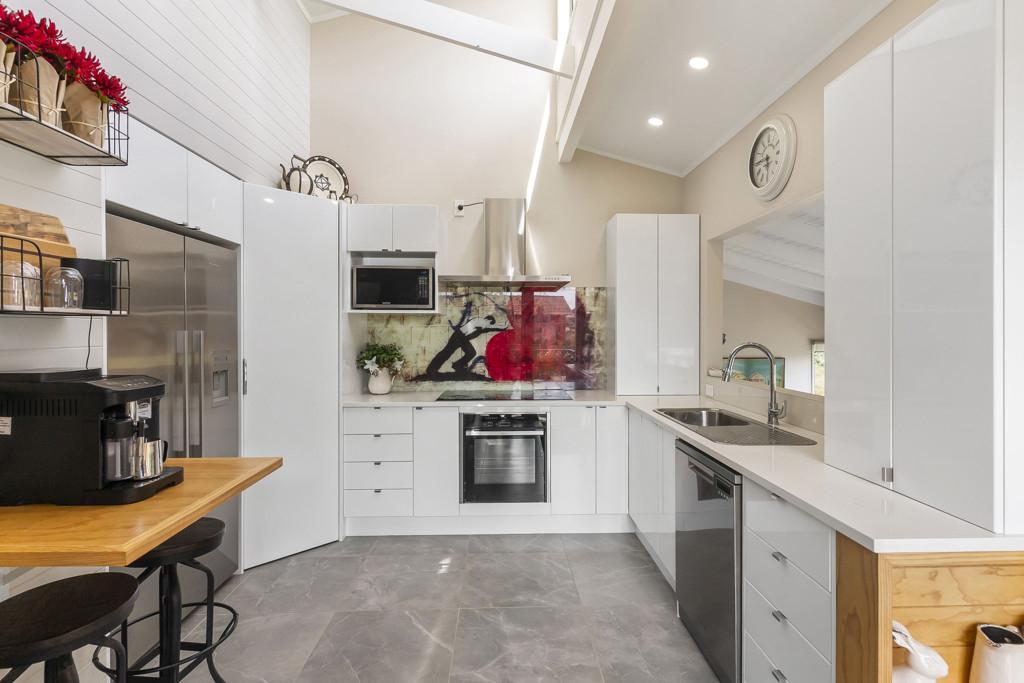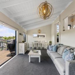 There's an ease to the flow here, the kind of layout that makes sense for both everyday routines and weekend hosting. At the heart of the home in the main living area with chic shiplap feature walls and spectacular vaulted ceilings. A wall of sliders frames the calming outlook across the Tamaki River and opens to the elevated deck for exceptional entertaining in the sunshine, while the contemporary kitchen overlooks the living area, designed to feel connected without dominating the space.
