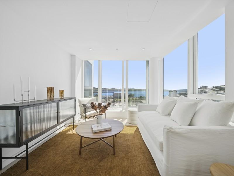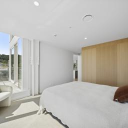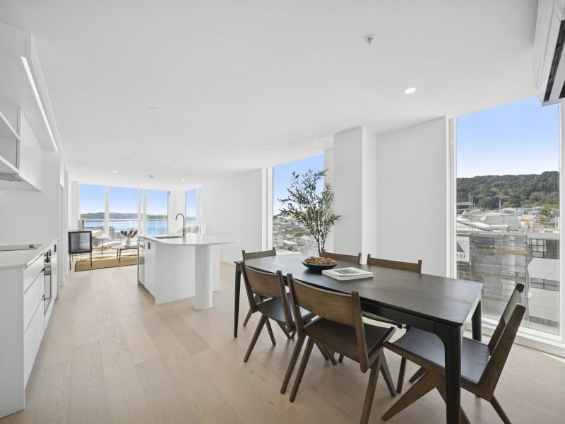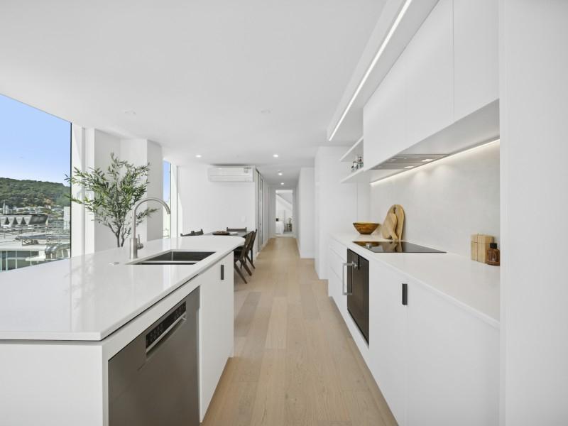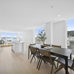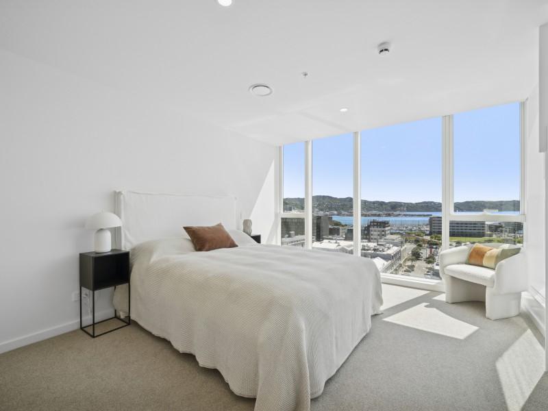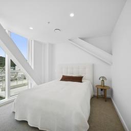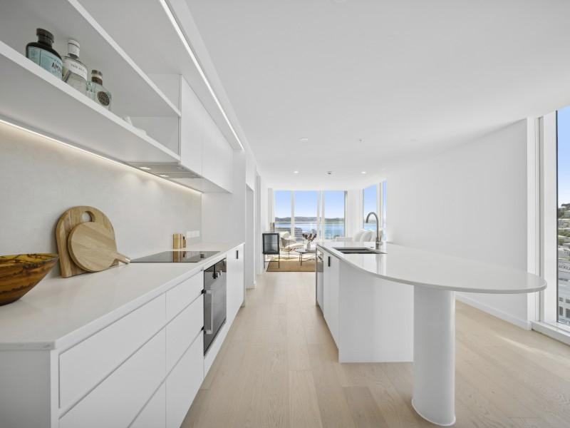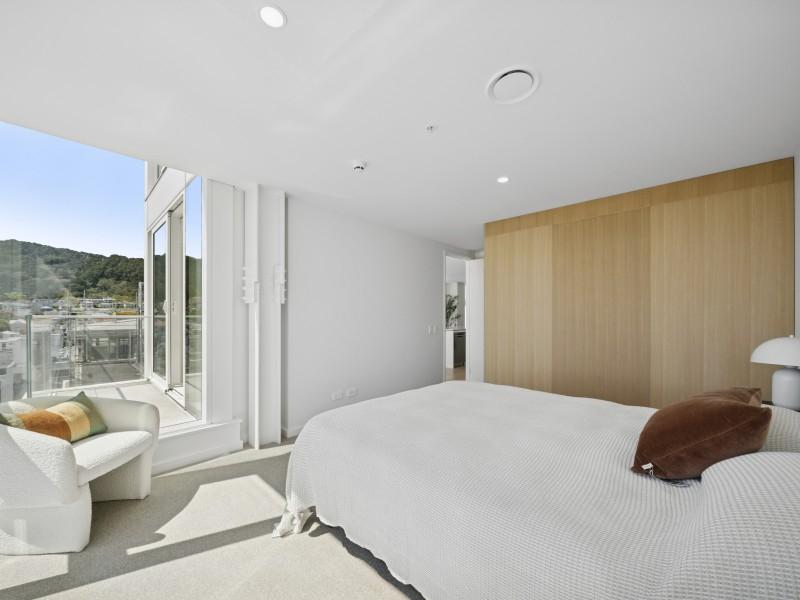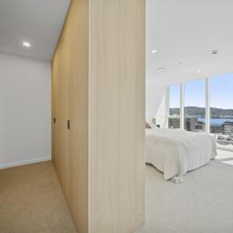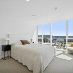 This recently completed penthouse at Hyde Lane has some of the best harbour views in the city! 1102 is positioned on the 11th floor of this high-rise, this design-led penthouse offers sweeping views across Wellington Harbour, Mt Victoria, and the CBD skyline. The open-plan living spaces offer floor-to-ceiling glazing, with natural light flooding into each space, accentuating refined architectural details and premium finishes. This penthouse showcases a light, contemporary palette complemented by natural textures and high-end fittings throughout.