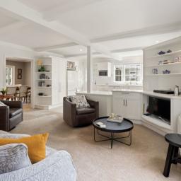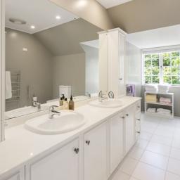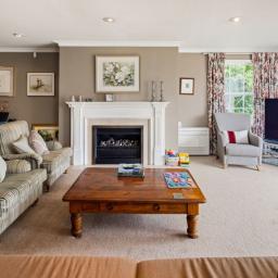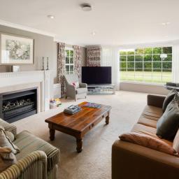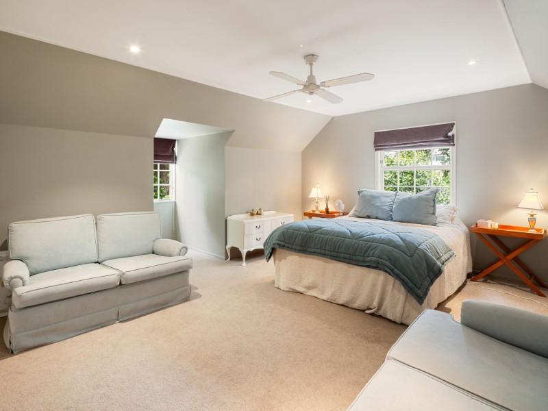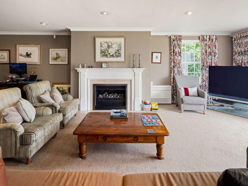 Separate dining room flows seamlessly into a gorgeous conservatory, offering pleasant views of the backyard oasis. The oversized lounge has a gas fire and heat pump and provides another space for relaxation and entertainment. Downstairs hosts two double bedrooms and a generous main bathroom, while upstairs there are two additional bedrooms, including the master suite, an office, and a second bathroom, all complemented by exceptional storage throughout.