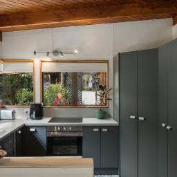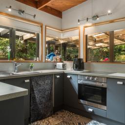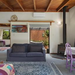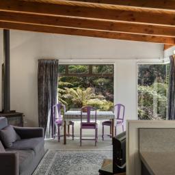 Thoughtfully laid out, the open-plan kitchen, living, and dining area feels bright and inviting. The character-filled kitchen features generous windows that frame the surrounding natural beauty, bringing the outdoors in. Large windows in the living area frame the surroundings beautifully, so from every angle you can take in the idyllic setting you're immersed in. A freestanding woodburner adds cozy warmth through the winter months, while two heat pumps provide instant comfort all year round.