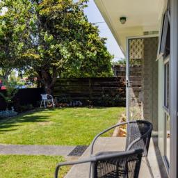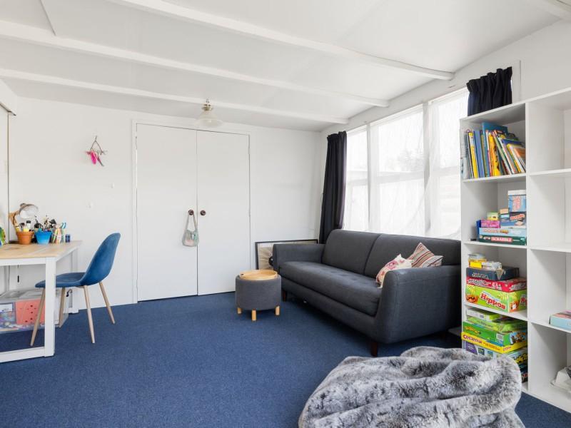 Bright and welcoming interior featuring three bedrooms and a well-appointed bathroom, including a consented conversion of the garage for extra flexibility. The open-plan living area flows seamlessly to a sunny front porch and fully fenced level lawns, perfect for children, pets, or relaxed outdoor living.