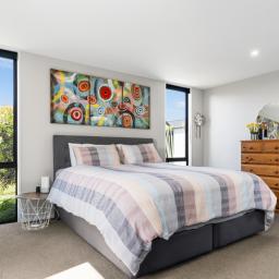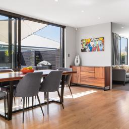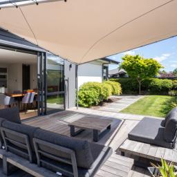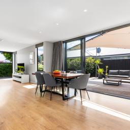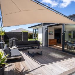 Seamless indoor-outdoor flow is achieved through large sliding doors that open to a spacious, private decked area. Complete with a shade sail for comfort creating the perfect setting for alfresco dining, entertaining friends, or simply unwinding in the sun. Multiple access points enhance versatility, offering endless opportunities for relaxed indoor-outdoor living. The outdoor area has been designed to accommodate the trampoline and swing set for growing families.