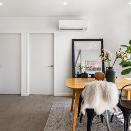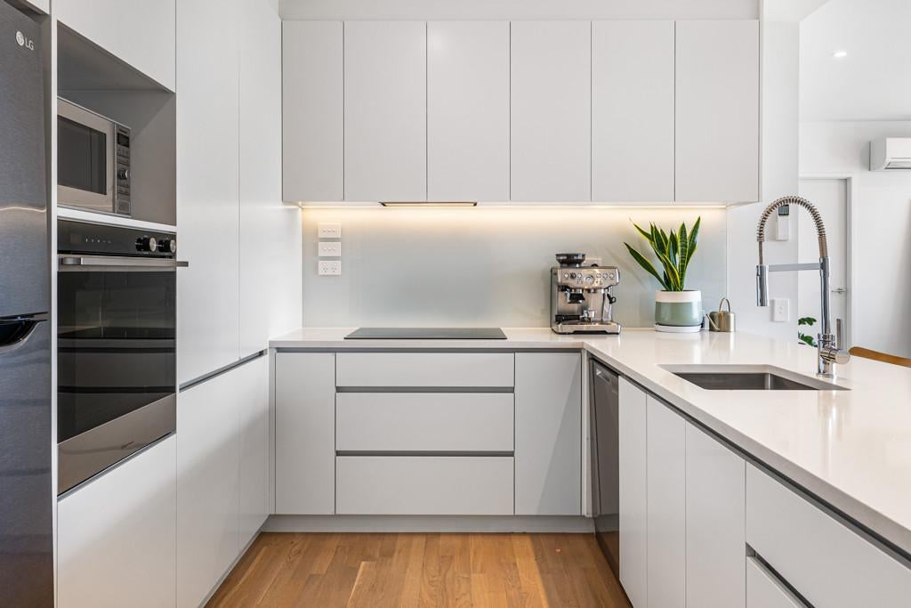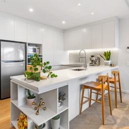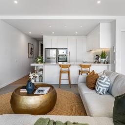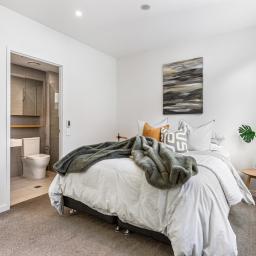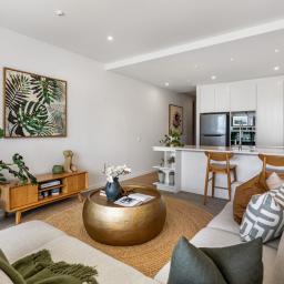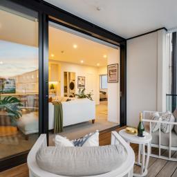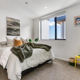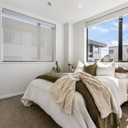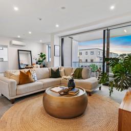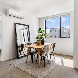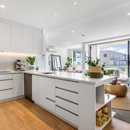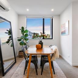 The expansive entertainer's kitchen is the heart of the home, featuring modern Fisher & Paykel appliances, abundant storage, and sleek finishes. Flowing seamlessly into the open-plan living and dining area, it extends out to a large west-facing balcony with Vitex hardwood decking -the perfect spot to unwind or entertain as the sun sets.