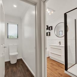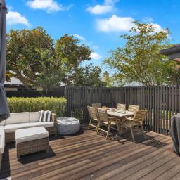 The heart of the home is its sleek, contemporary kitchen, seamlessly integrated with open-plan dining and living zones, while a separate lounge offers the ideal retreat for relaxation or entertaining. Designed with family living in mind, the home enjoys superb indoor-outdoor flow through ranch sliders from both the living area and primary suite, opening to expansive Thermory Ash decking that soaks up the sun with its north-facing aspect.