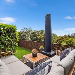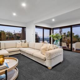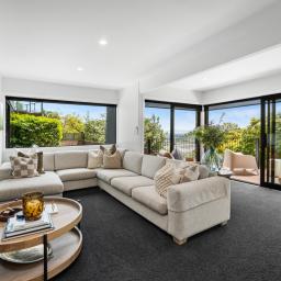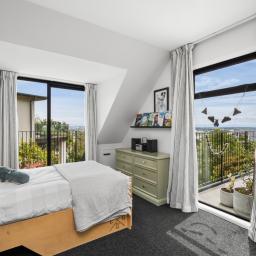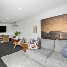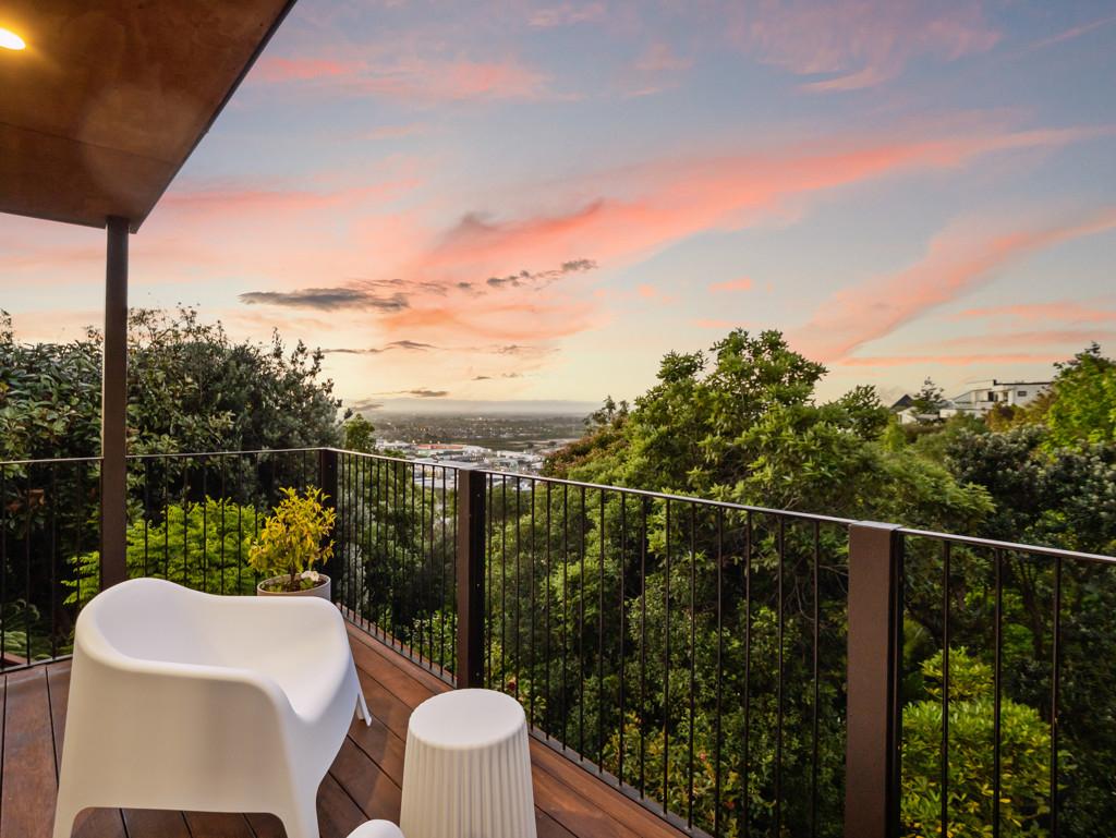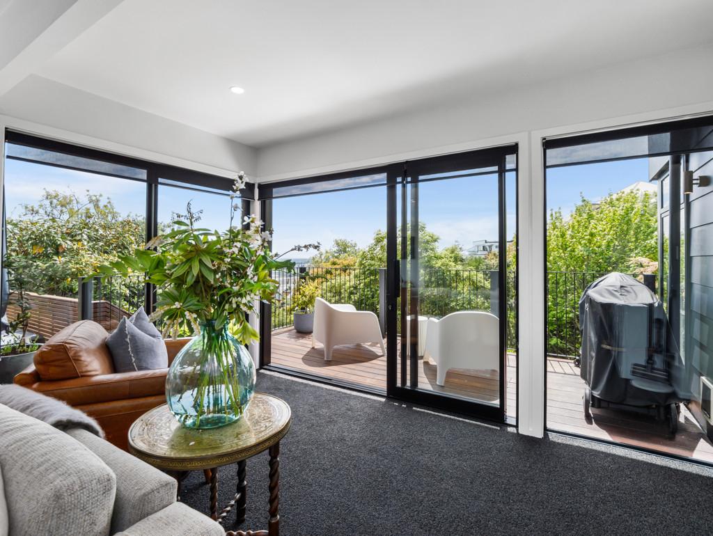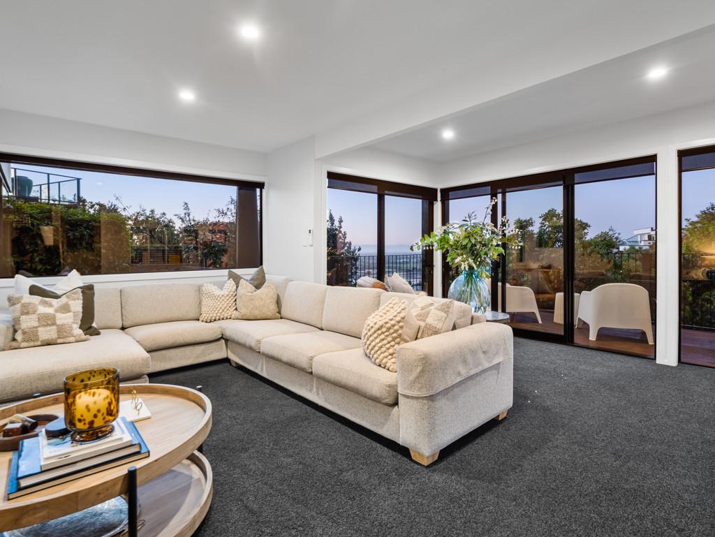 Spacious open-plan living and dining areas connect seamlessly through multiple sliders, opening to large windows that frame the ever-changing views - from the twinkling city lights to the Alps and estuary beyond. The kitchen is sleek and chic, featuring quality appliances, gas cooking, abundant bench space, and clever inbuilt storage - ideal for the home entertainer.