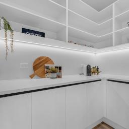 • Chef's kitchen featuring a 2800mm x 1000mm engineered waterfall stone benchtop with marble veining,