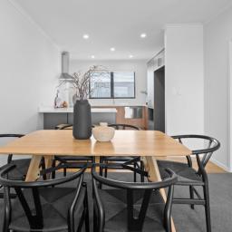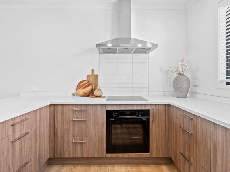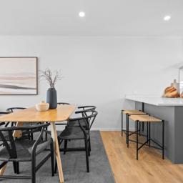 The sleek kitchen features modern appliances, clean lines, and warm timber tones, creating a space that’s as welcoming as it is functional. Upstairs is the master bedroom & ensuite, downstairs offer two bedrooms & a beautifully appointed bathroom to complete the picture with quality finishes and a calming neutral palette.