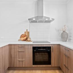 The kitchen is both stylish and functional, showcasing warm wood tones, stone benchtops, and sleek modern appliances. Upstairs is the master bedroom & ensuite, downstairs offer two bedrooms & a beautifully appointed bathroom to complete the picture with quality finishes and a calming neutral palette.