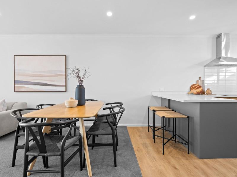 Step inside and you’ll find a beautifully light, open-plan layout where the kitchen, dining, and living areas flow seamlessly together. A sliding door opens onto a sunny deck — your private spot to enjoy a morning coffee or unwind after work.