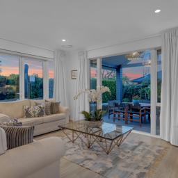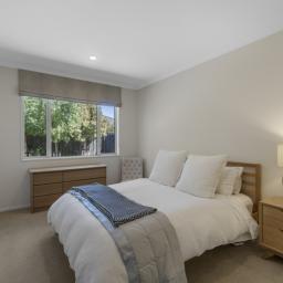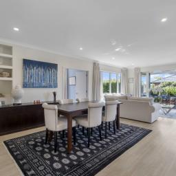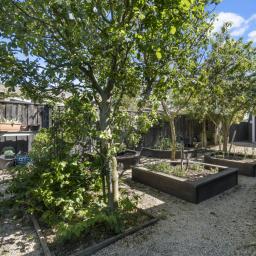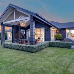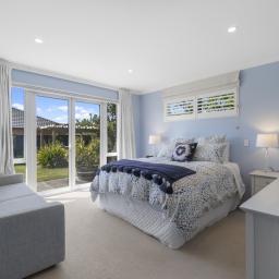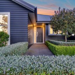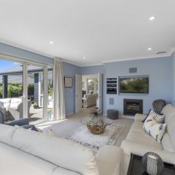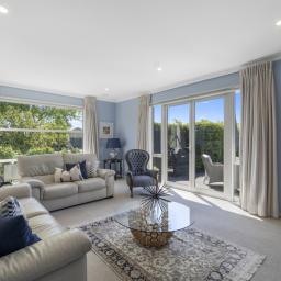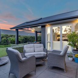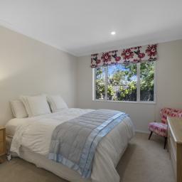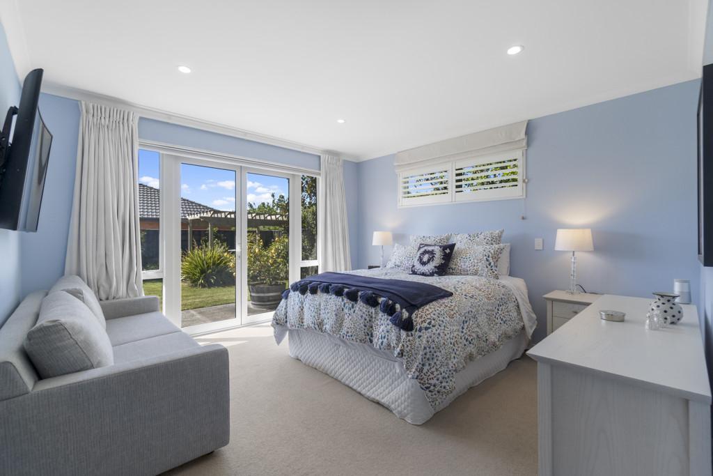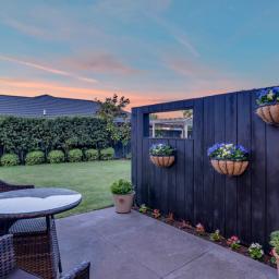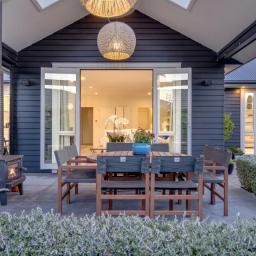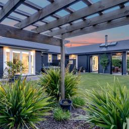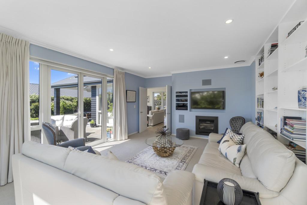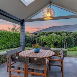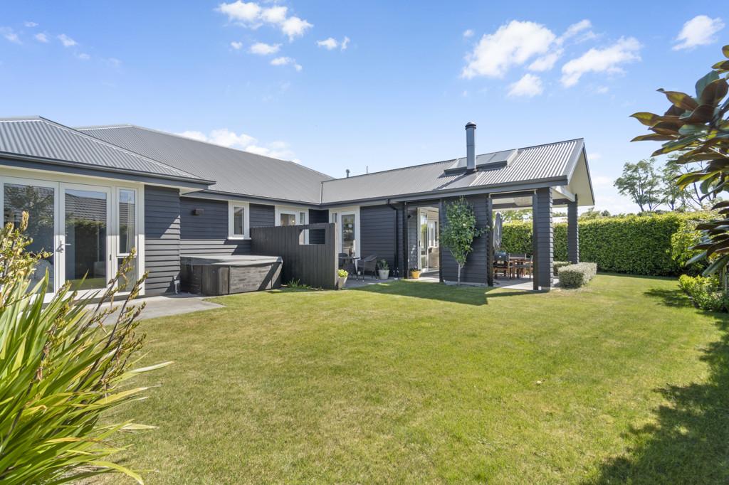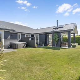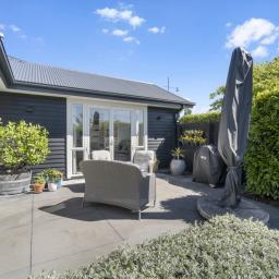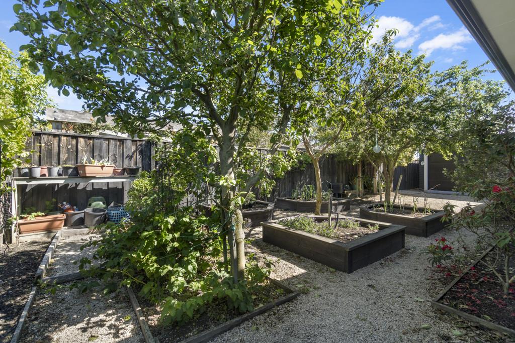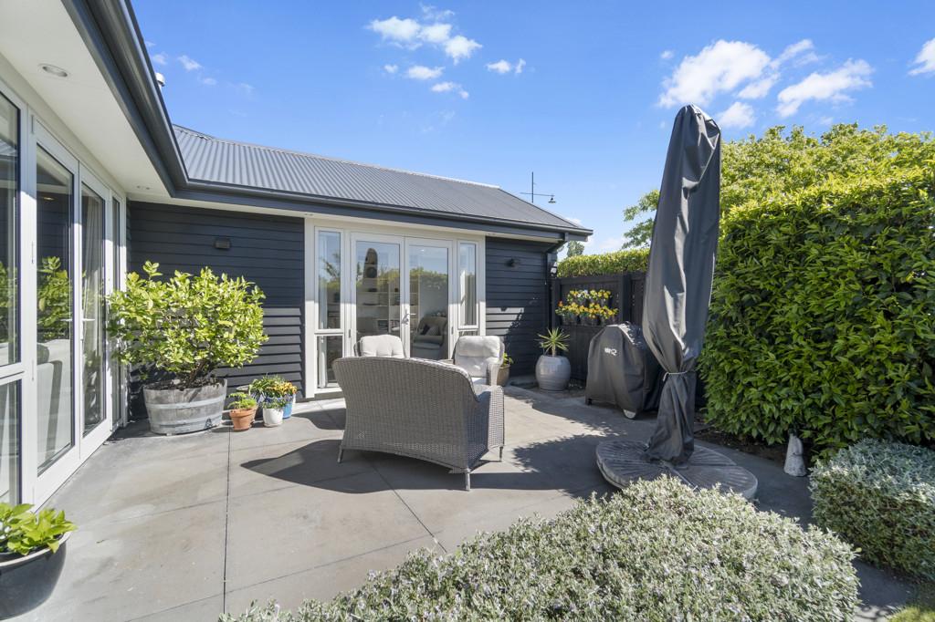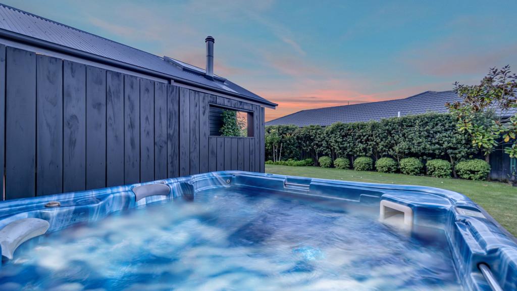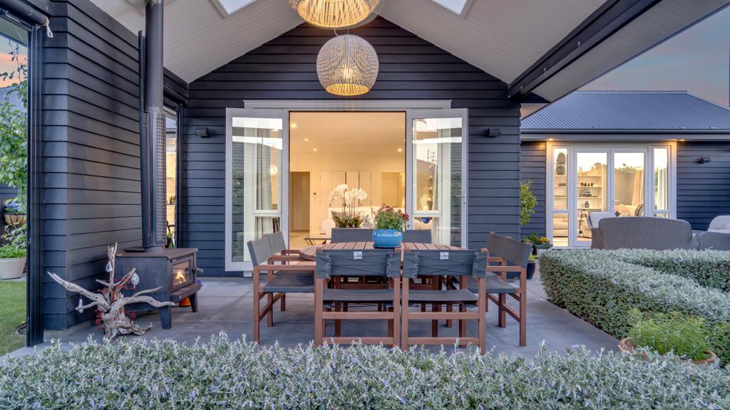 The outdoor living spaces are of special note, with the main outdoor space being semi-enclosed, with a roof and skylights, a log burner for warmth and ambience, and ample space for a dining table, chairs, and other bits and pieces coming together to create an exquisite outdoor room. There's also a spa pad, a patio outside the main bedroom, and a lovely sitting area in the corner of the garden. No expense has been spared on the garden, and it is beautiful. On one side, you can enjoy lush lawns and clever, attractive planting, while the other is set up with fruit trees and irrigated raised garden beds. Deliberately set up to be low maintenance, you'll easily keep it looking great by trimming the hedges and doing a bit of lawn care.