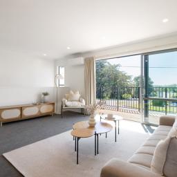 Upstairs, the light-filled second level is the heart of the home, showcasing an open-plan kitchen, dining, and living area that connects seamlessly to a deck, creating the perfect indoor-outdoor flow for entertaining or relaxing. The modern kitchen has been fitted with quality appliances including a Bosch wall oven, Fisher & Paykel single dish drawer, a tiled splashback, and sleek cabinetry for a polished, contemporary finish.