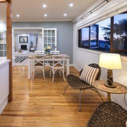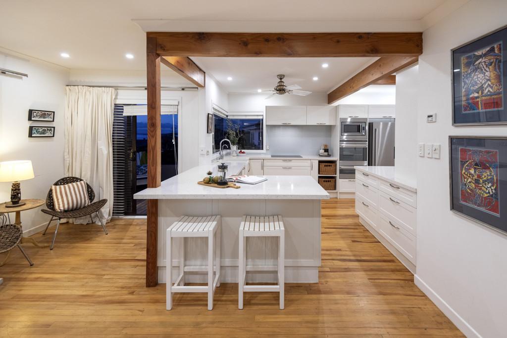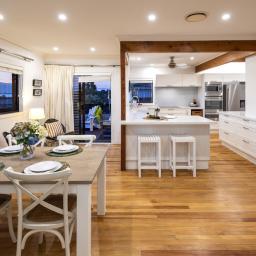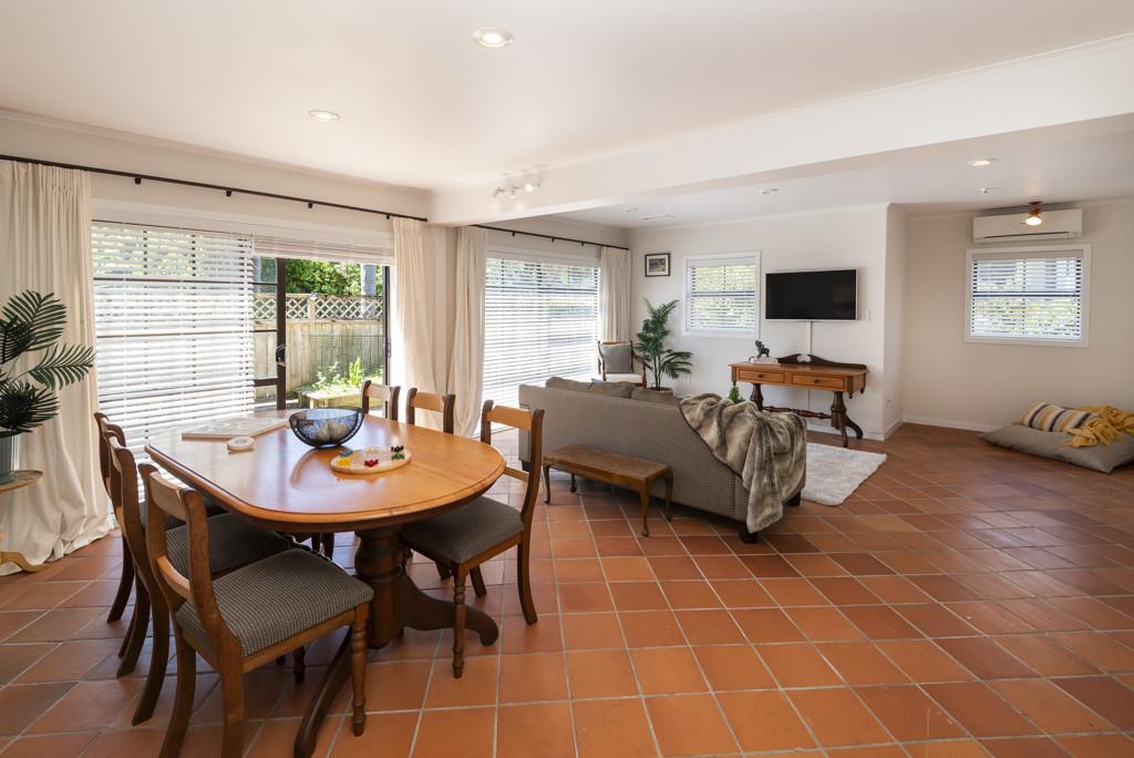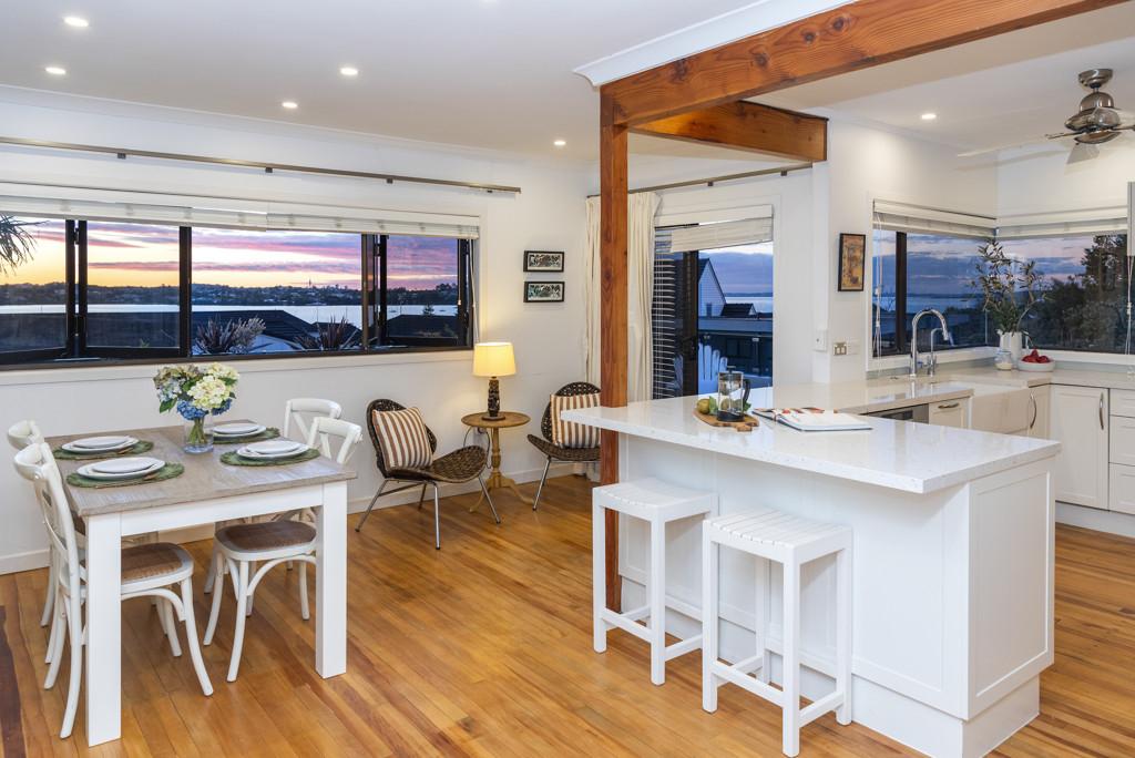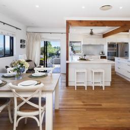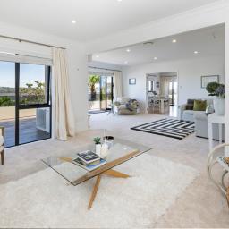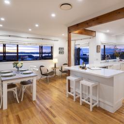 Flowing seamlessly from the kitchen, the open-plan family, dining, and living areas are flooded with natural light and offer a sense of freedom and connection, all while enjoying beautiful sea views.