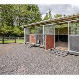 Equestrian and rural features have been carefully integrated with two stables, an enclosed grooming area, and well-fenced paddocks. Completing the picture are a custom-built chicken coop and dog kennels, to keep the pets as happy as the owners!