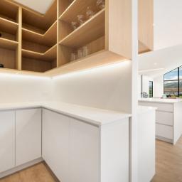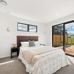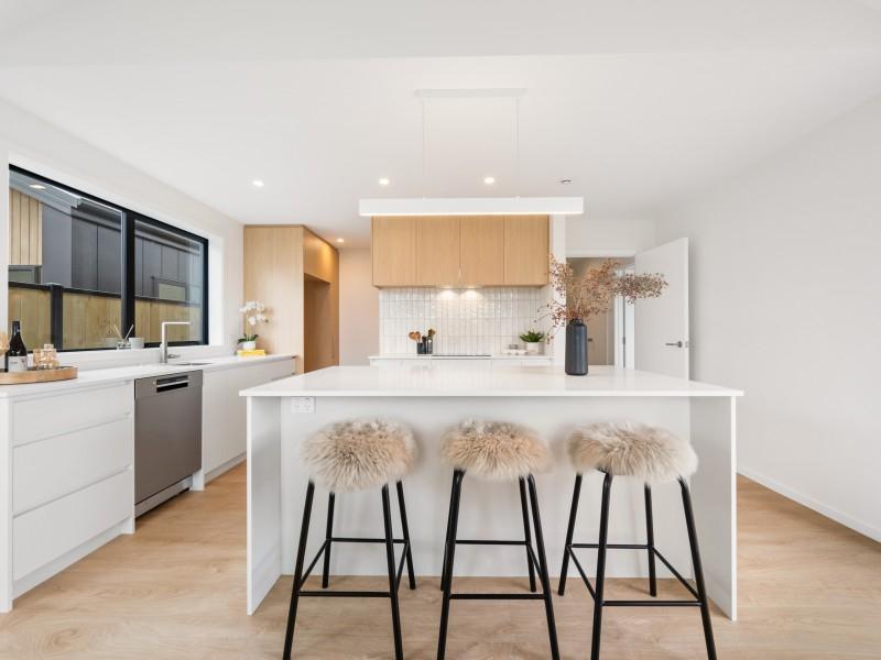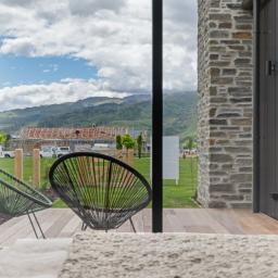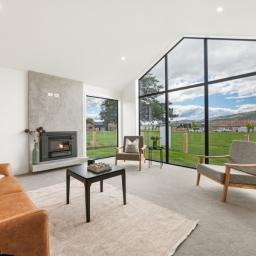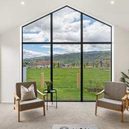 A dramatic raked ceiling and expansive glazing define the open-plan living area, drawing in natural light and framing the surrounding mountain and reserve outlooks. At the heart of the home is a generous kitchen designed for those who love to cook and entertain – featuring an impressive supersize island bench, extensive bench space, quality appliances including an induction hob, and a walk-in pantry. This is a space where style and function come together seamlessly. A log burner, heat pump and heat transfer system ensure warmth year-round, while thermally broken, Low-E Argon-filled windows enhance comfort and efficiency.