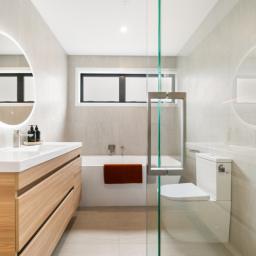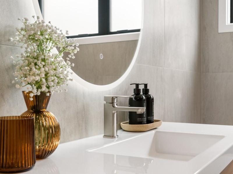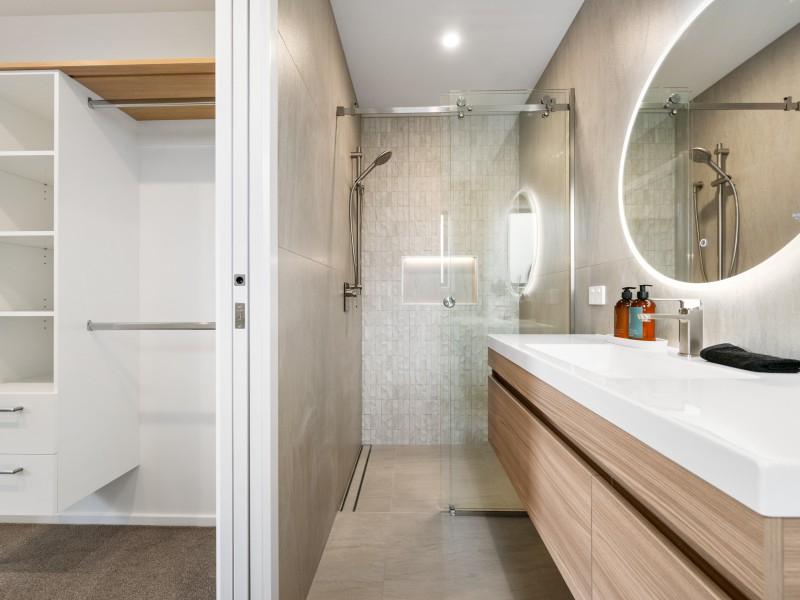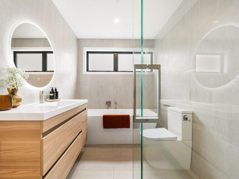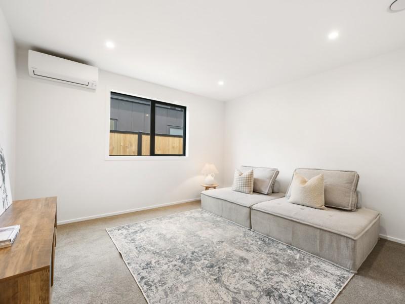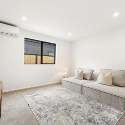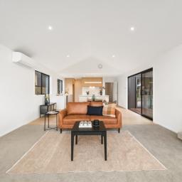 The layout has been thoughtfully designed to adapt to family life or guest living. Three double bedrooms are complemented by a large separate media room – an ideal second living area or generous fourth bedroom, depending on your needs. The primary suite is a real treat, complete with a walk-through wardrobe, a fully tiled ensuite and external access, while the main bathroom mirrors the home’s refined finishes and attention to detail with gorgeous tiling, separate shower and bath and under tile heating. Internal access to the single garage and a dedicated laundry area add practicality to the home’s streamlined design.
