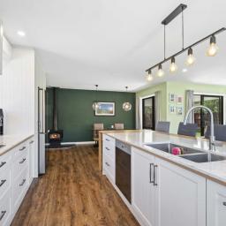 The heart of the home is the open-plan kitchen, dining and living area, featuring a brand-new kitchen (installed 2023), fireplace, and heat pump for year-round comfort. A covered outdoor dining area extends your living space outdoors — perfect for entertaining.