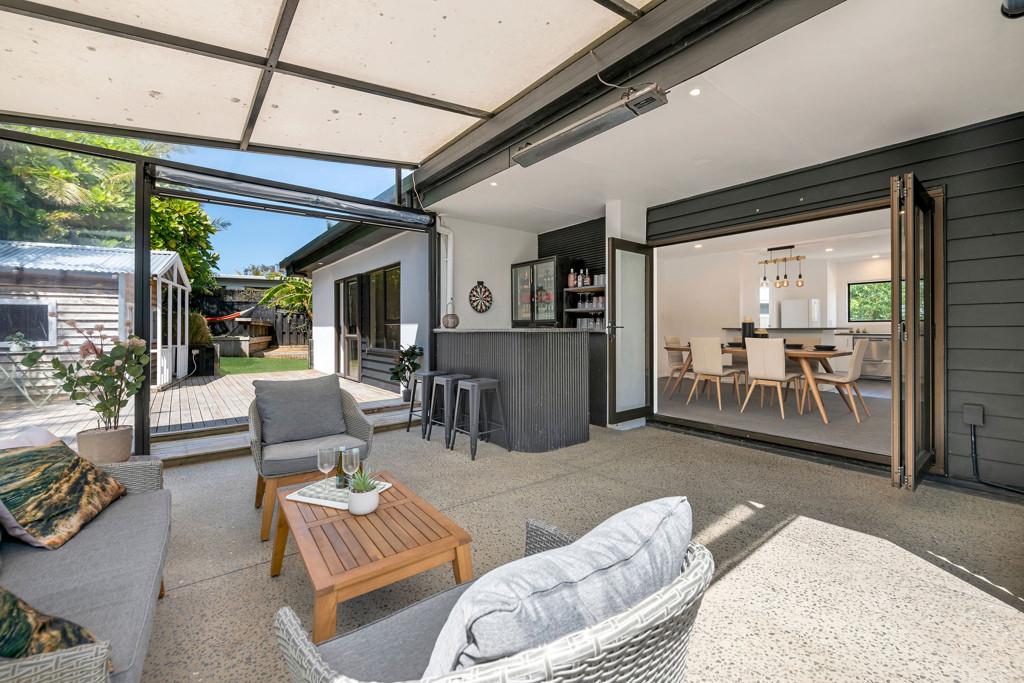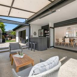 The light-filled living room welcomes you with warmth and space, while three generous double bedrooms and a renovated bathroom with a separate toilet provide comfort and convenience for the whole family. The modern, open-plan kitchen flows effortlessly into the spacious dining area, which extends to a sheltered patio with drop-down screens, a bar and an outdoor heater- ideal for alfresco dining, entertaining guests, or simply unwinding outdoors throughout the year. Comfort is guaranteed with three heat pumps and a ventilation system, keeping every corner of the home inviting in every season. A separate laundry completes the picture.