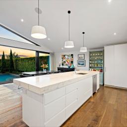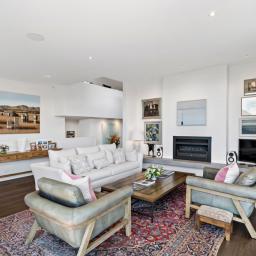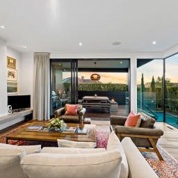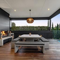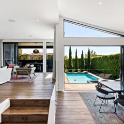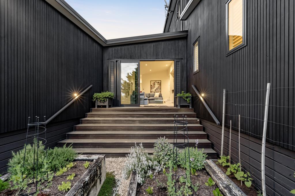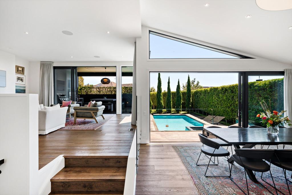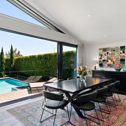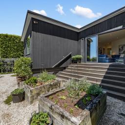 A strong connection to the outdoors defines the home's appeal. Soaring ceilings, large windows, and wide doors lead to outside areas that are perfect for summer entertaining or quiet relaxation. Step out of the living area to a sheltered deck with an outdoor fireplace and heater, which makes alfresco living a year-round pleasure. Step down from this to the sunny in-ground pool, spa, and lounging area, which is in full view of the living and kitchen. The beautifully planned potager garden, picking garden, and fruit trees complete the picture, offering seasonal produce just steps from the kitchen.