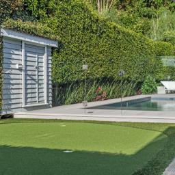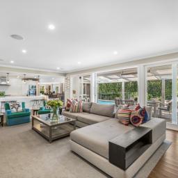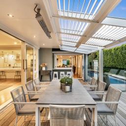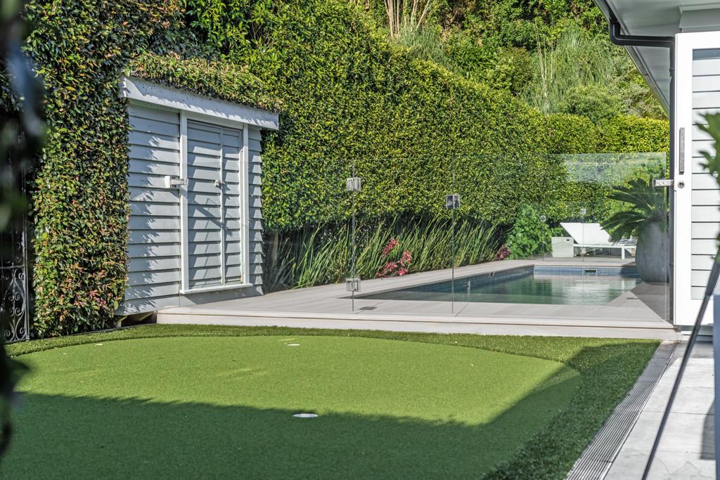 Multiple sliders and doors connect seamlessly to a covered outdoor dining terrace with a shuttered roof system and cocktail bar, offering an all-season alfresco experience. Watch family and friends enjoy the heated pool and putting green, making this a true resort-style sanctuary.