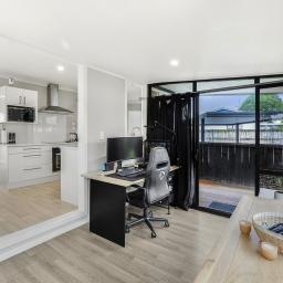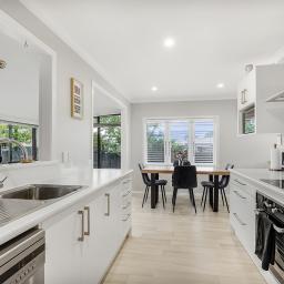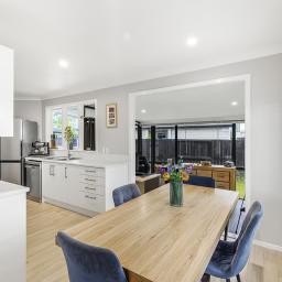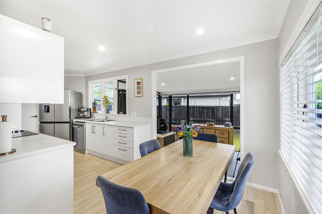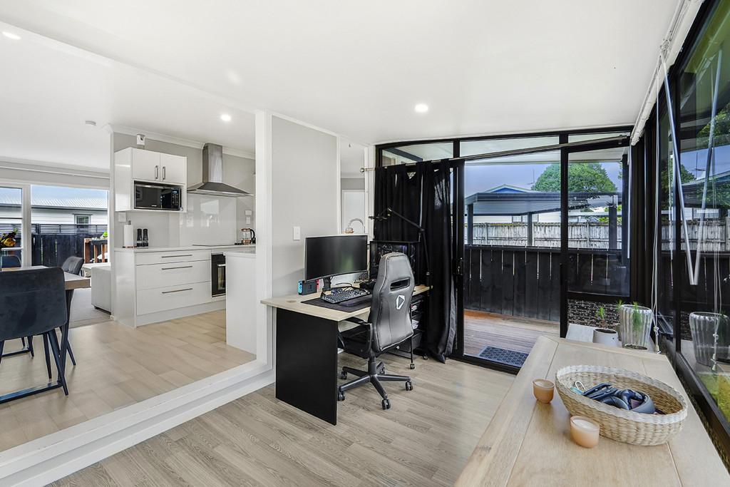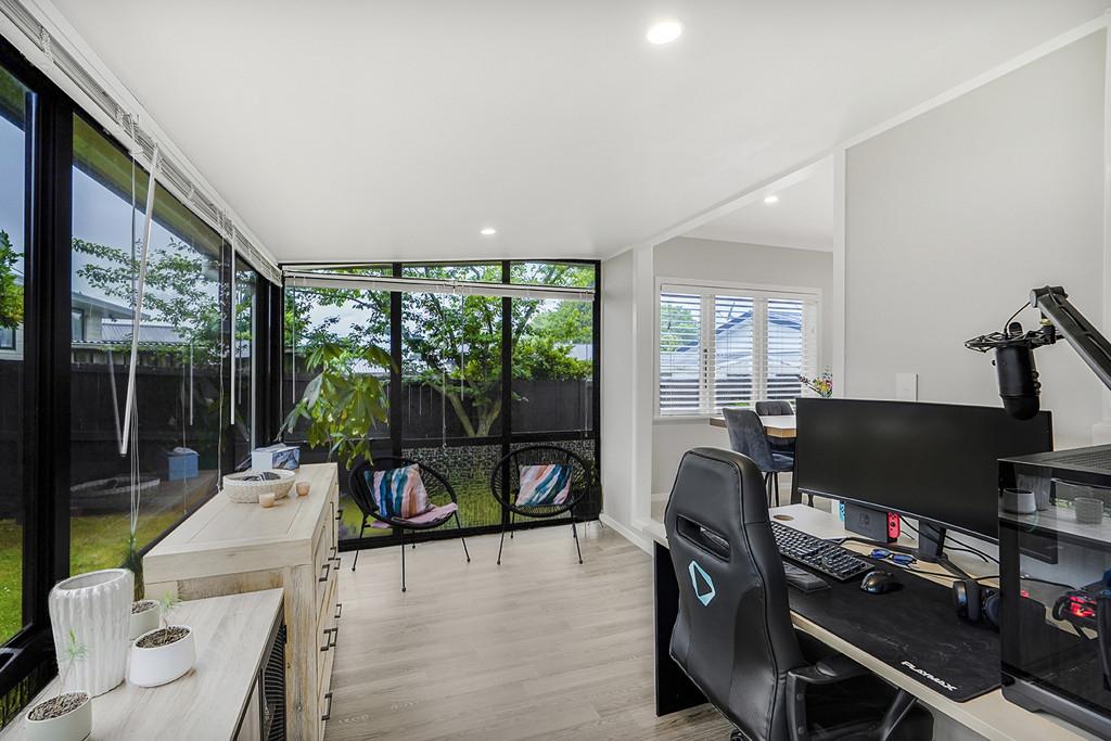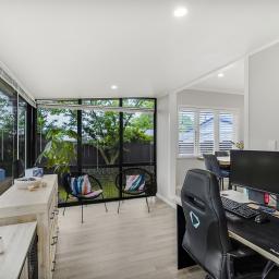 The open-plan kitchen and dining area create a welcoming space at the heart of the home, perfect for family meals and conversation. Off to the side, a sun room currently used as an office offers flexibility for working from home, a playroom, or simply a quiet spot to relax with a coffee.