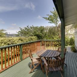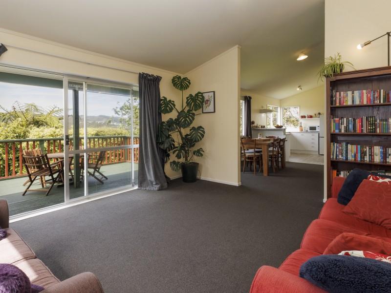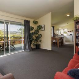 The lounge, dining and kitchen are open with great flow and from the lounge - glass sliders lead out to a stunning deck with a pretty bush outlook across to the hills.