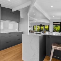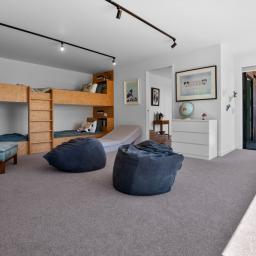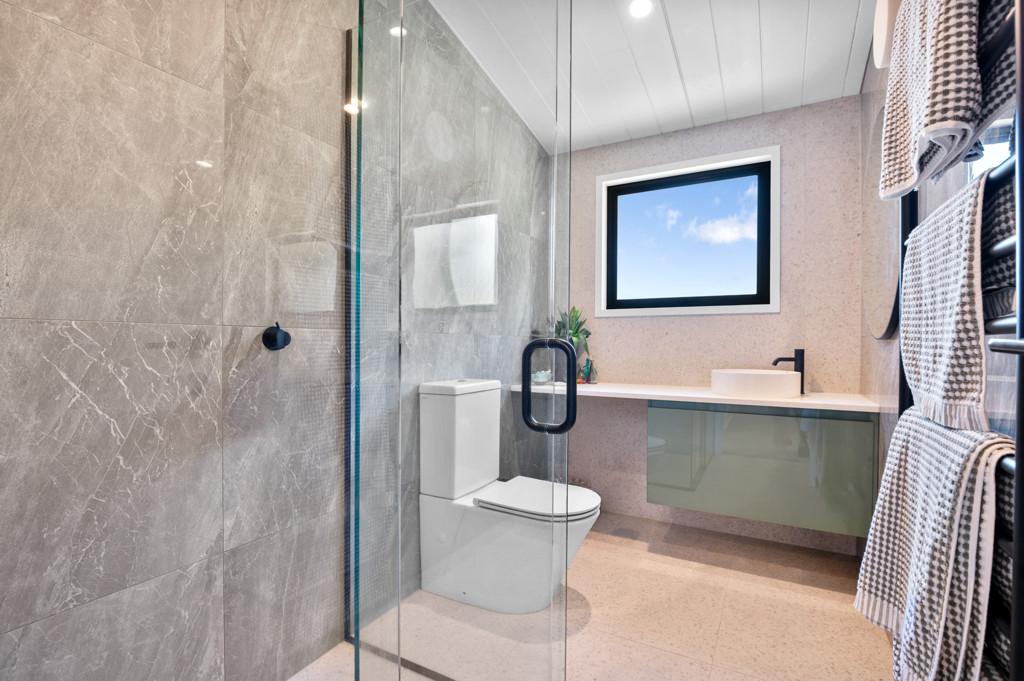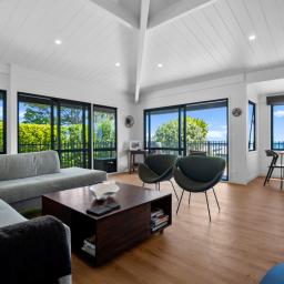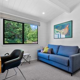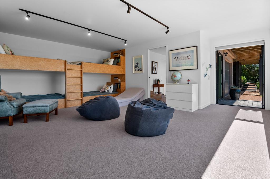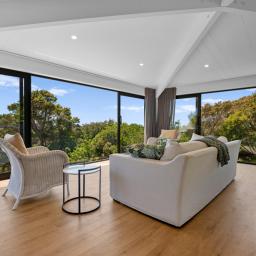The top level of the home feels like your own treehouse, where Tui and Kereru flutter in the trees and Kaka soar by at eye level, immersing you in nature's own wildlife show. Large sliding doors and windows on both levels seamlessly connect indoor living with the stunning outdoor environment, creating a harmonious indoor-outdoor flow.