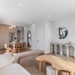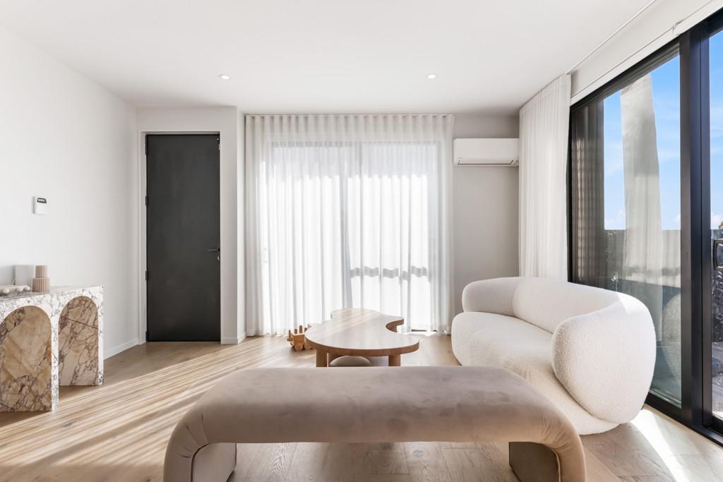 On the first floor, European oak timber floors flow throughout the open-plan living space, where natural light pours in, enhancing the contemporary design. The designer kitchen boasts high-end Bosch appliances, sleek cabinetry, and durable Dekton stone countertops, perfect for both everyday meals and entertaining. The bedroom on this level is currently used as a second living area and could easily serve as a home office, also opens to an outdoor garden.