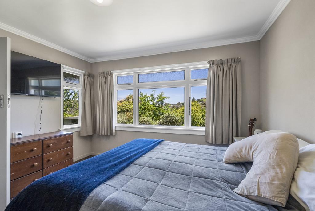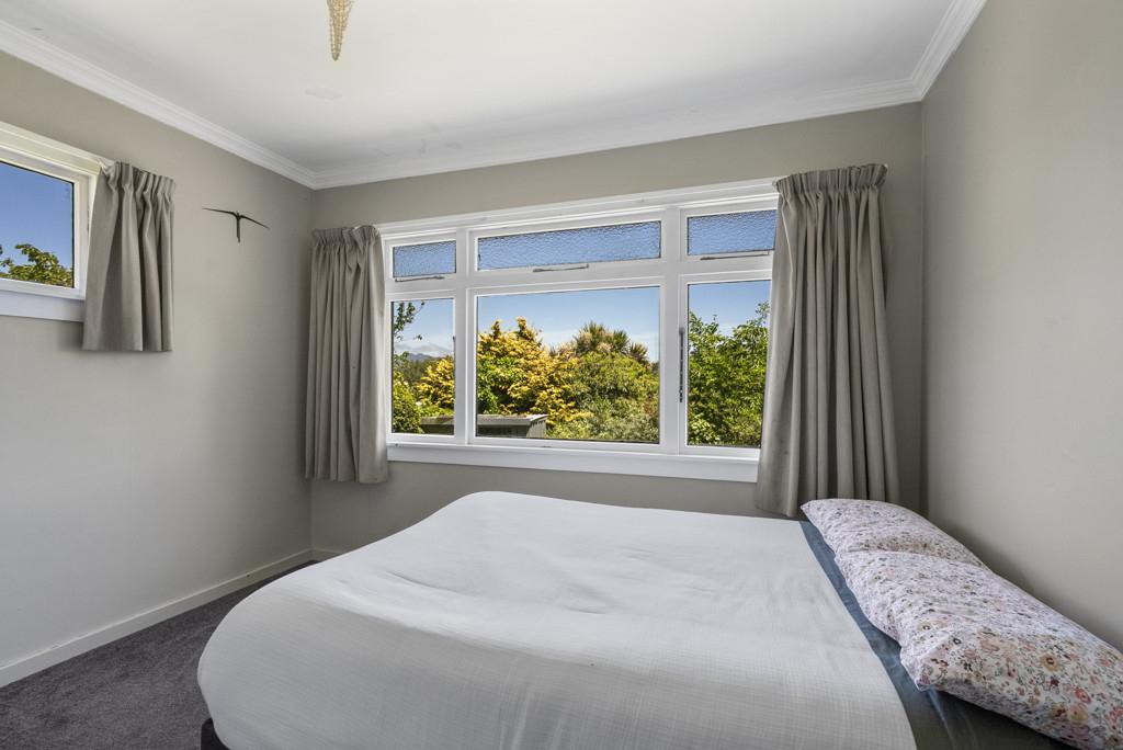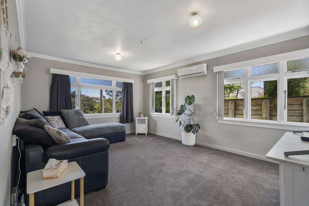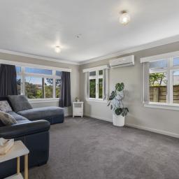Inside, the home feels warm and welcoming. The living area captures leafy green views through large windows, creating a relaxed atmosphere for family time or quiet evenings in. A heat pump keeps the home comfortable all year round.