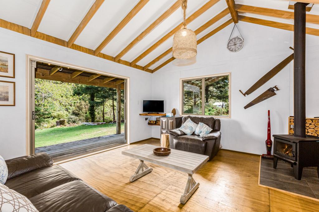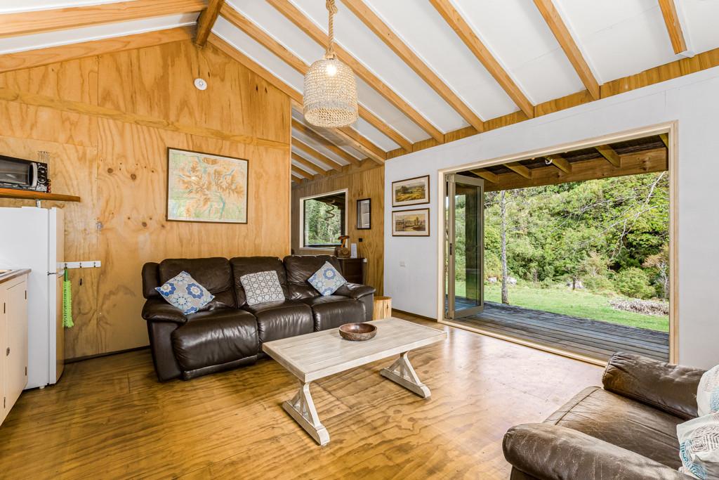 Set on a generous 11.5898 hectares (more or less) of nature-filled land, this distinctive property features a bespoke studio designed to harmonise beautifully with its natural surroundings. The interior features one well-appointed bedroom and a spacious mezzanine floor, offering flexibility for guests, a reading nook, or a creative space. The open living area is anchored by a cosy wood burner, creating the perfect atmosphere for relaxation and unwinding during the cooler months. A well-sized bathroom and practical layout make everyday living both comfortable and efficient.