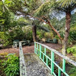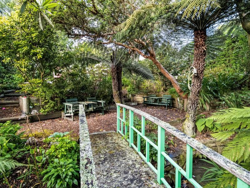 The grounds are just as special as the home and views. Thoughtfully landscaped and terraced, with established plantings, they offer a series of private spots to relax and explore. There are sunny, elevated vegetable beds, shaded garden paths that meander through the property to hidden surprises, including a flat lawn for play, and a bridge over a small creek. Multiple outdoor areas provide sheltered spots for quietly enjoying the serenity, while well-positioned gates around the garden ensure there are various safe spaces for children and pets alike to roam.