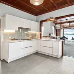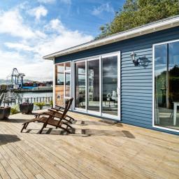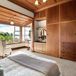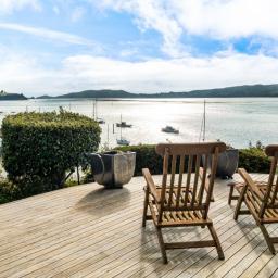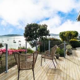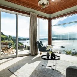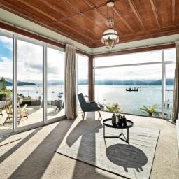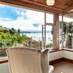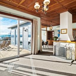 The large, contemporary bathroom cleverly combines laundry facilities, while the sleek, modern kitchen impresses with exceptional storage, high quality appliances, and a seamless flow into the generous dining space. A striking double-sided fireplace connects this area to the first of two inviting living spaces. Beyond, the second living room features floor-to-ceiling windows capturing breathtaking views across Careys Bay and the harbour beyond. Both spaces open out to a wraparound deck, the perfect place to soak in the scenery, sun and scents of a luxurious garden.