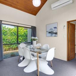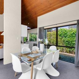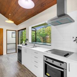 The modernised kitchen features sleek cabinetry, tiled splashbacks, and a large picture window that floods the space with natural light. The open dining area connects seamlessly to both the kitchen and outdoor courtyard, creating a sense of flow that makes everyday living effortless.
