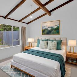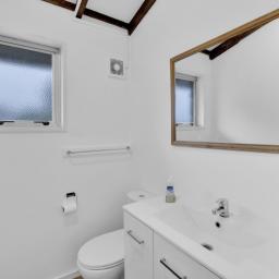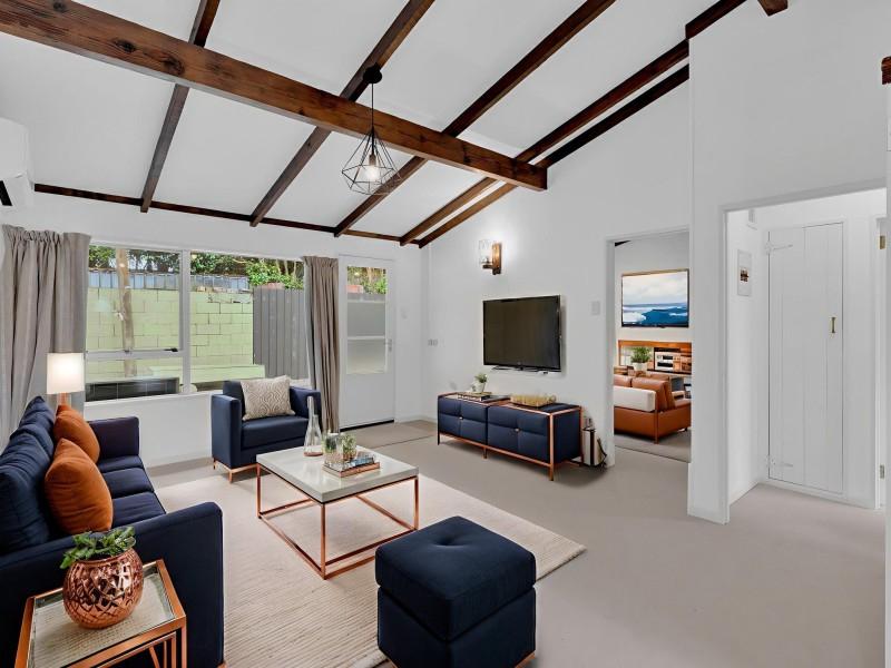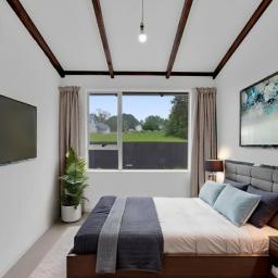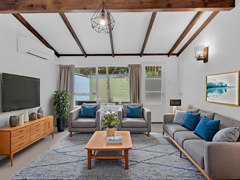 The open-plan living area flows to a contemporary kitchen, with vaulted ceilings enhancing the sense of space. A heat pump provides year-round comfort, keeping things cosy throughout the year.