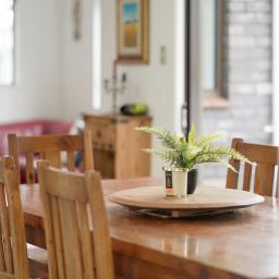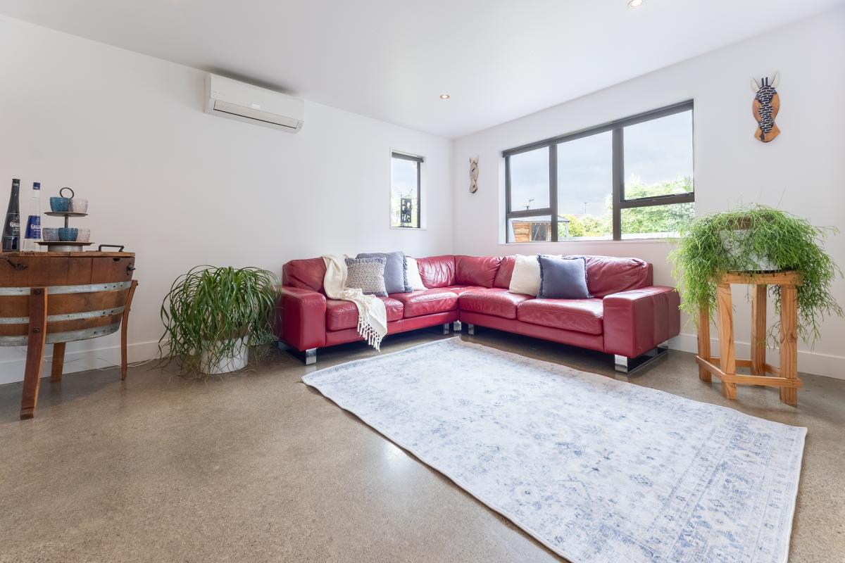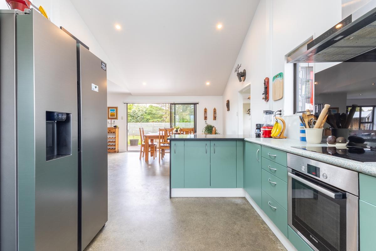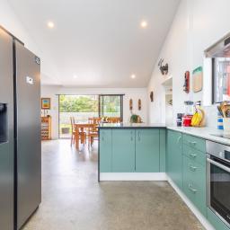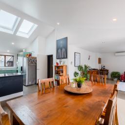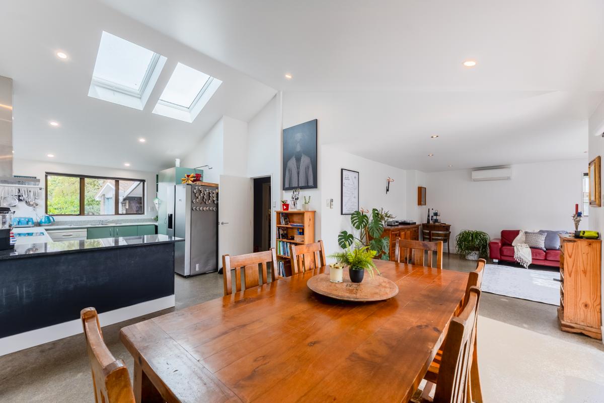 Step inside and the welcome is immediate. An entrance opens into the centre of the home, the kitchen, dining, and family room, beneath vaulted ceilings, with honed concrete underfoot for easy family living, and west-facing light pouring in. It's a space shaped for gatherings - BBQs on the patio, kids on the lawn, doors open to the breeze.