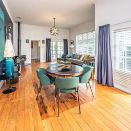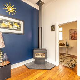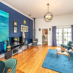 The open-plan kitchen, dining, and living area has been masterfully designed for seamless indoor-outdoor flow. French doors invite you to both the sun-drenched rear deck and the charming covered front porch, while a wood burner with heat transfer system ensures year-round comfort and ambience.