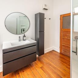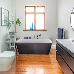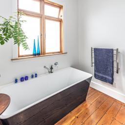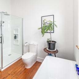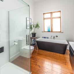The beautifully appointed family bathroom showcases contemporary style with a luxurious freestanding bath and separate shower-a sophisticated sanctuary for relaxation. The modern laundry with additional toilet adds practical convenience to daily life.