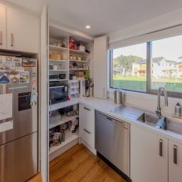 Fisher & Paykel fridge (ice & filtered water), AEG oven + induction, Miele dishwasher; extended peninsula, ceiling-height cabinetry, double pantry, double sink with disposal. Custom window seat, projector mount with pre-wired 5.1, and dedicated fibre (not shared)—great for remote work.