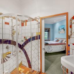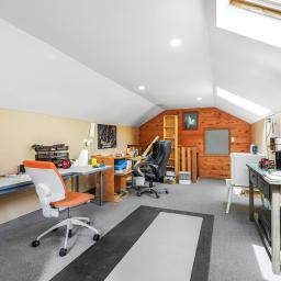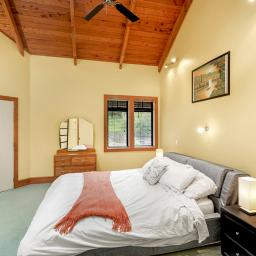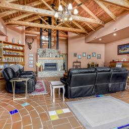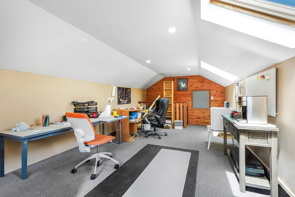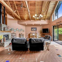 The ground floor features a self-contained suite - perfect for guests, extended family, or additional income. At the heart of the home, a grand open-plan living area with six-metre exposed redwood ceilings and an Otago schist fireplace creates a stunning space for both relaxation and entertaining.
