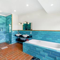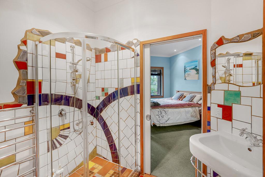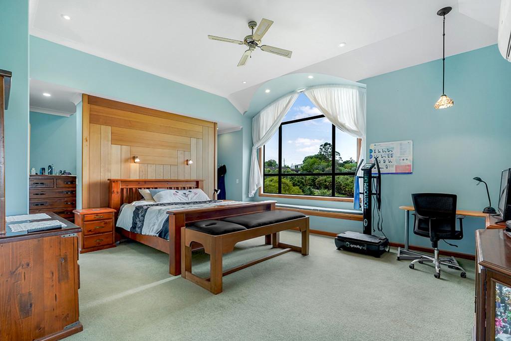 The master suite is a private retreat, complete with high ceilings, a balcony overlooking the landscape, and a beautifully tiled ensuite featuring an Italian bath and oversized shower.