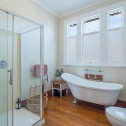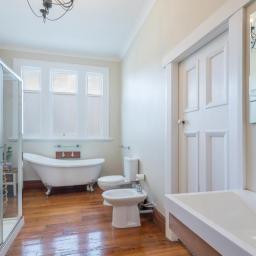 The main bathroom is also light filled, offering modern living while keeping its character features, with a claw foot bath, polished wooden flooring and wood detailing, plus there is direct access to the 3rd bedroom.