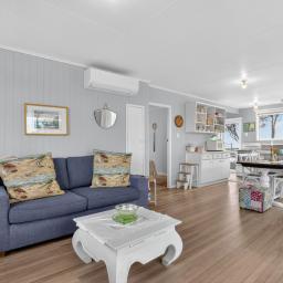 The refreshed and stylish open-plan living area opens out to the front deck to soak in the colours over the bay. A sunny, versatile sunroom extends the living space, making it perfect as a morning retreat, extra lounge area, or a quiet spot to unwind after a day at the beach. There are two comfortable double bedrooms , one of them leading to the laundry and the sunny private courtyard at the back perfect for long lunches and evening BBQs.